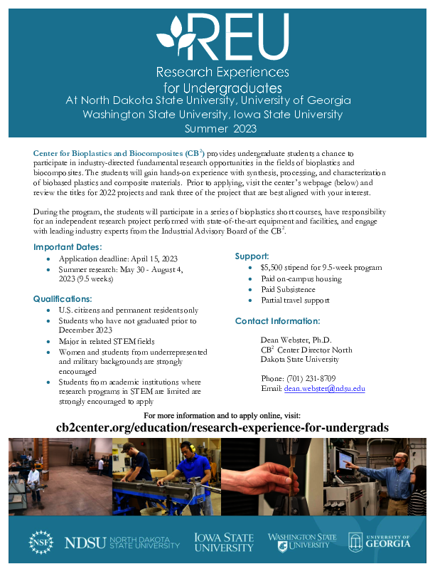 Each year, students (recruited primarily from academic institutions where research programs in STEM are limited) work on research projects currently being conducted by CB² sites such as Washington State University, Iowa State University, University of Georgia, and North Dakota State University. During the program, the students participate in a series of bioplastics short courses, have responsibility for an independent research project performed with state-of-the-art equipment and facilities, and engage with leading industry experts from the Industrial Advisory Board of the CB².